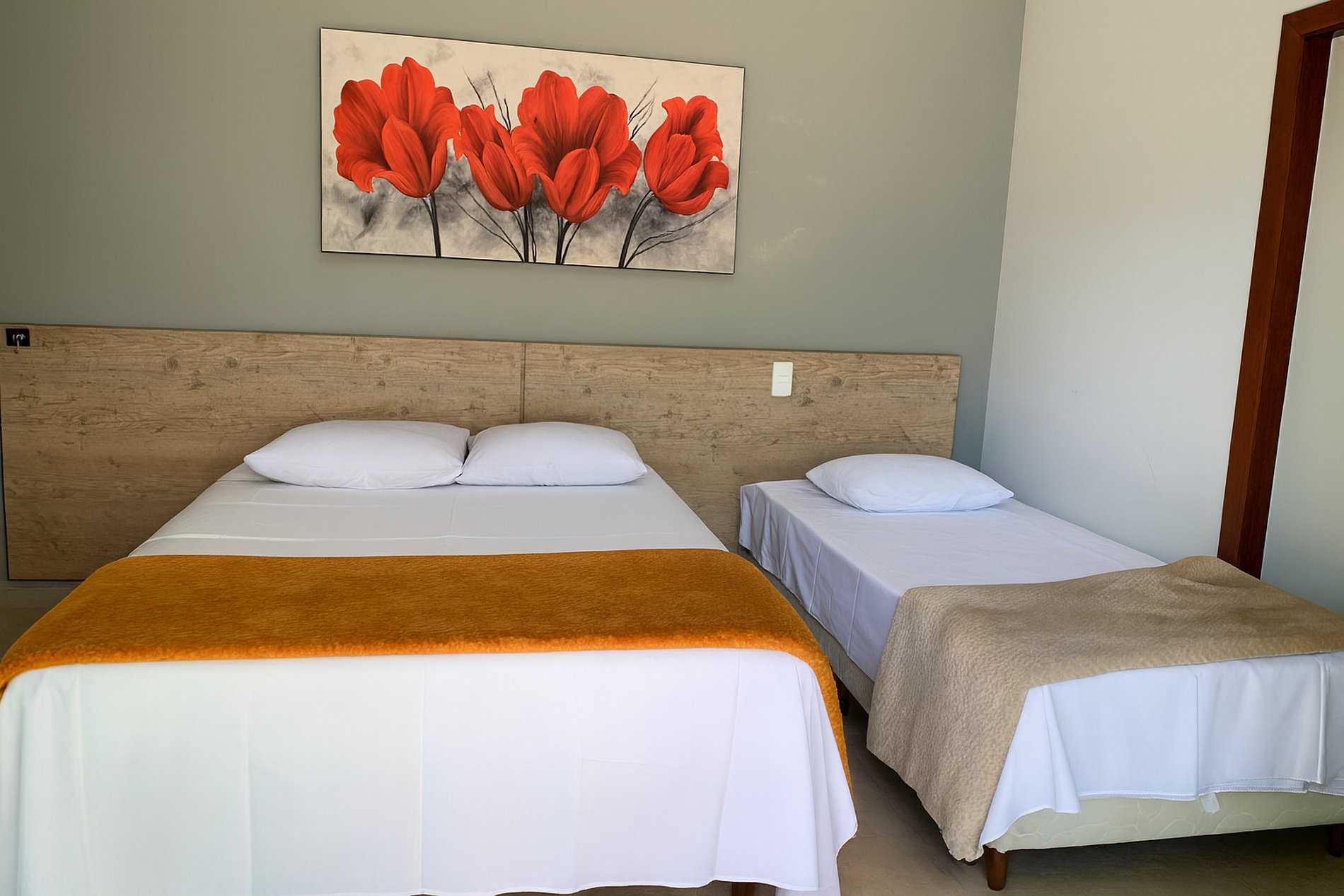 -Suíte: cama Casal padrão (188cm x 138cm), cama de solteiro (188cm x 88cm), cortinas blackout, frigobar e ar condicionado.