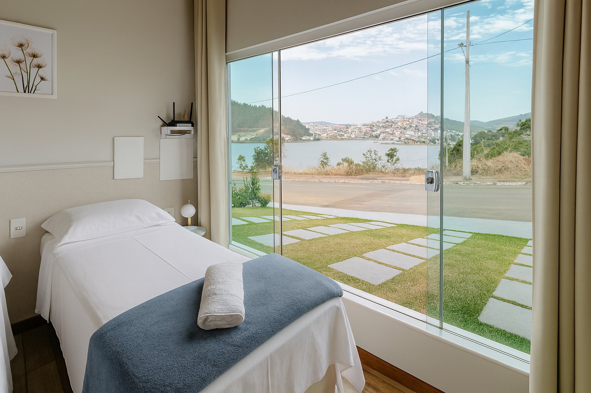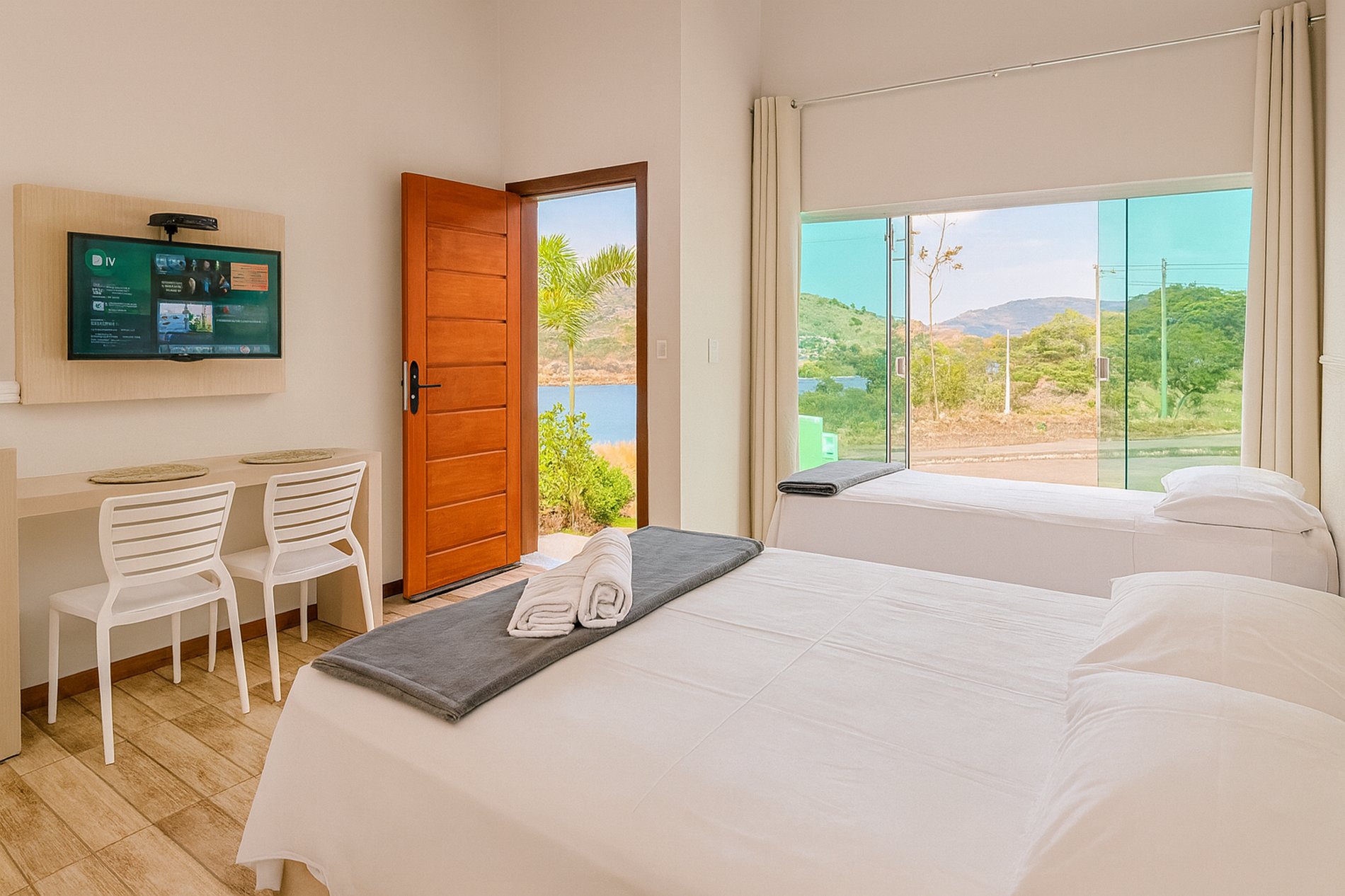 Quarto com vista panorâmica para o lago e montanhas.