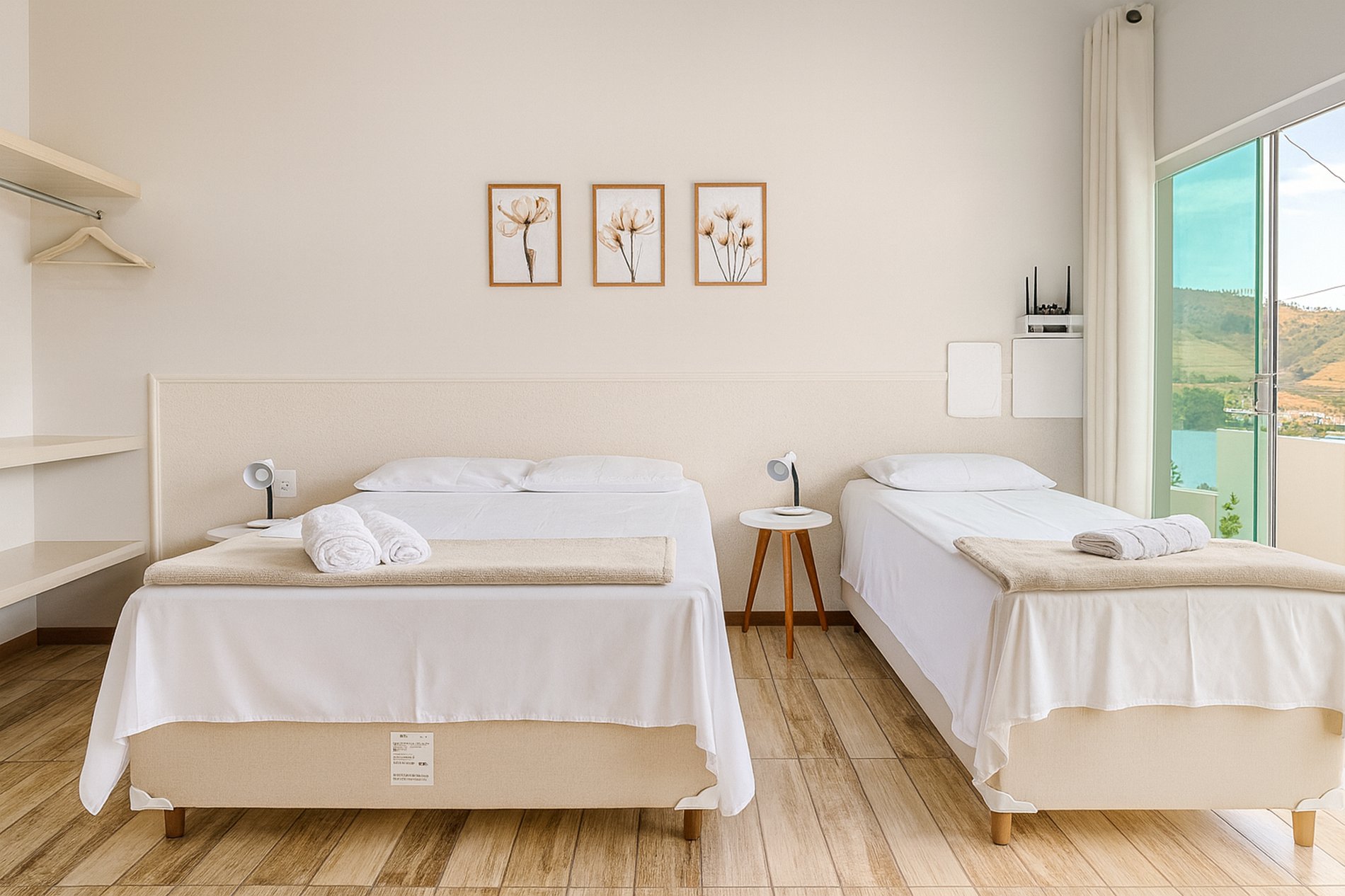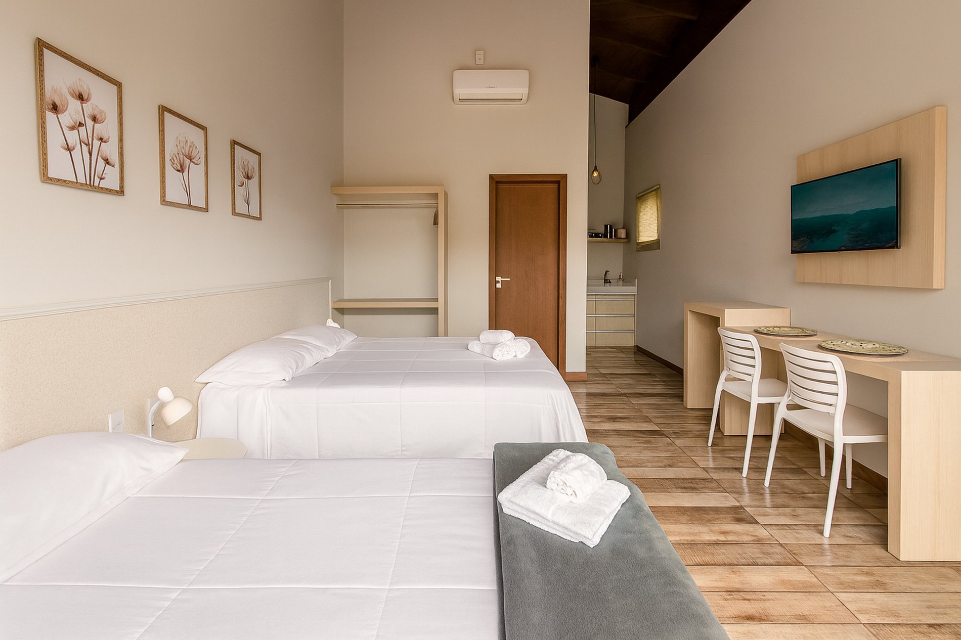 Suíte: Cama Casal (188cm x 138cm), Cama solteiro ( 188cm x 88cm), ar-condicionado, aparador de roupas e cortina blackout. Enxoval Completo.