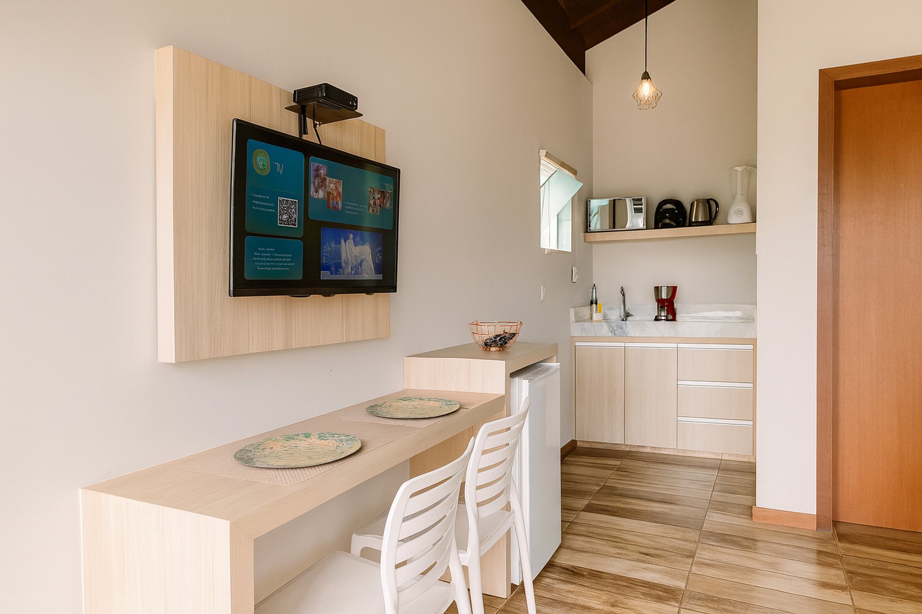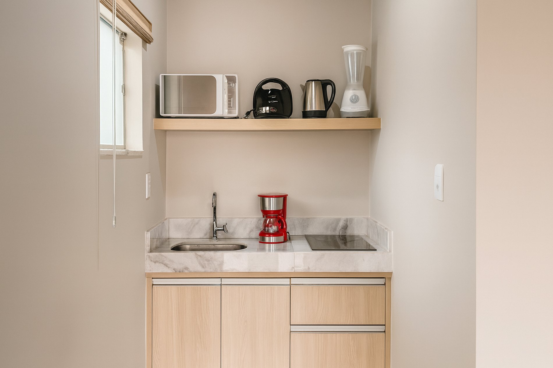 Cozinha :Frigobar, mesa com 2 cadeiras, fogão cooktop 2 bocas, microondas, liquidificador, máquina de café, Chaleira, Panelas e Talheres, TV Smart.