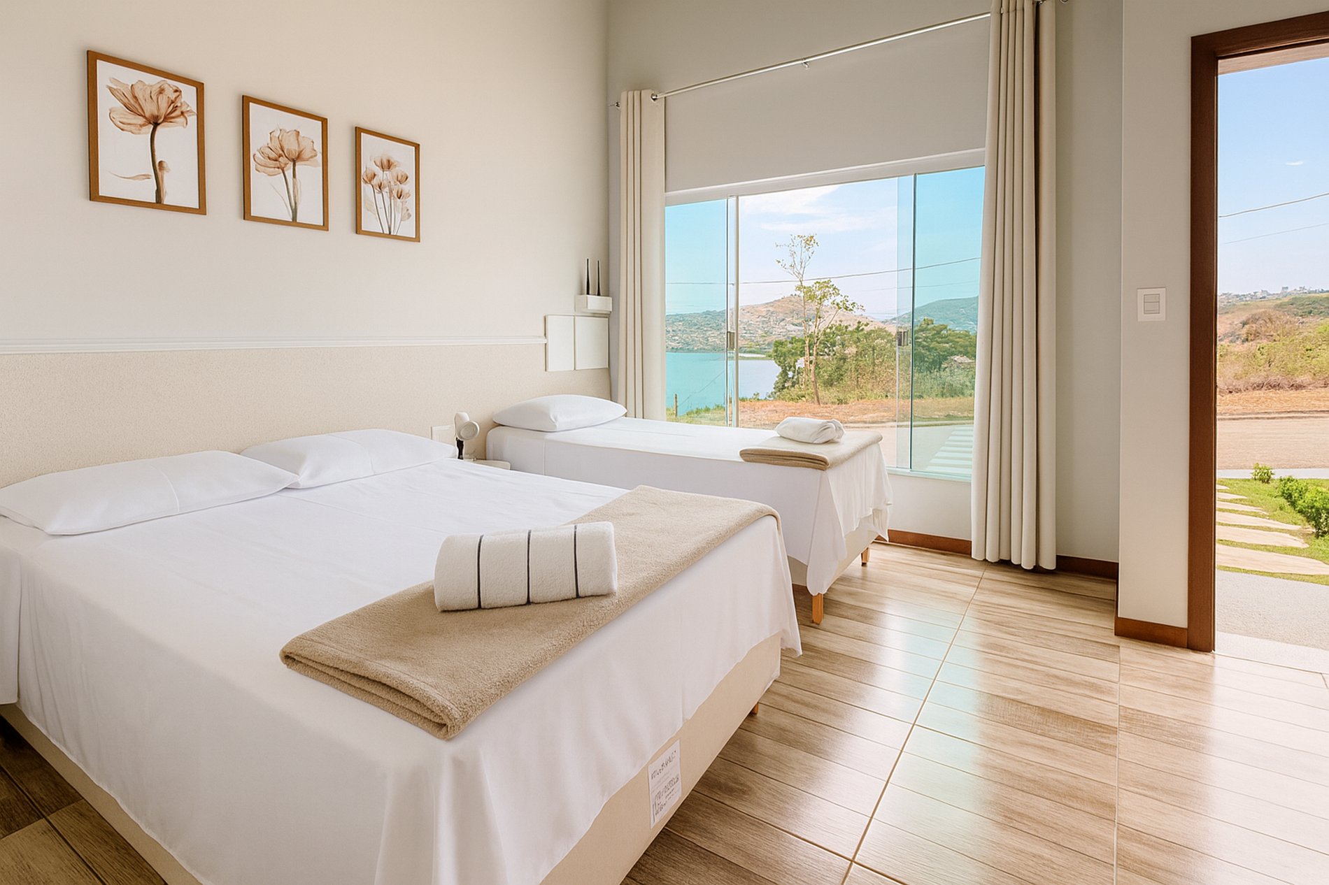 Suíte: Cama Casal (188cm x 138cm), Cama solteiro ( 188cm x 88cm), ar-condicionado, aparador de roupas e cortina blackout. Enxoval Completo.