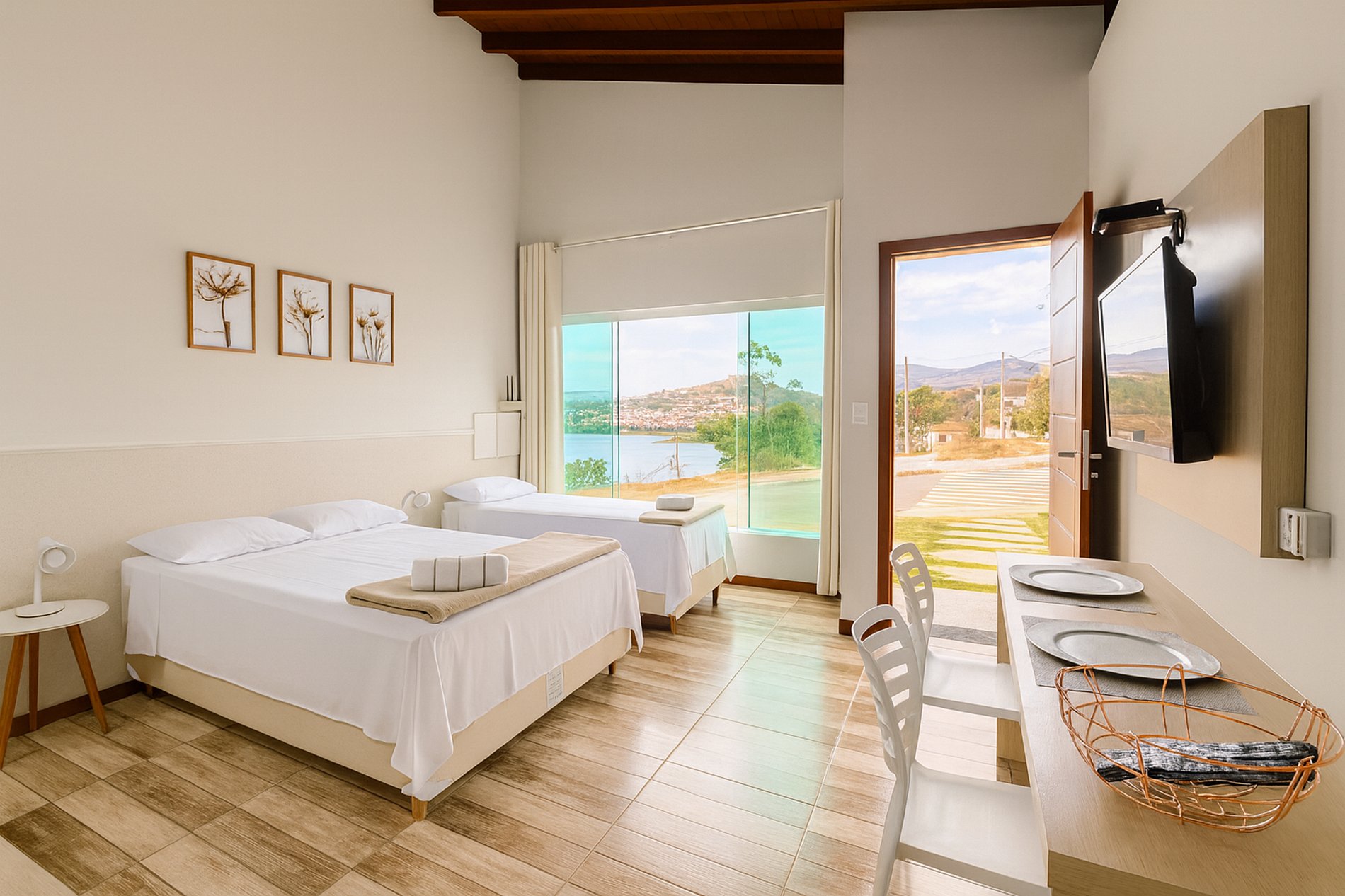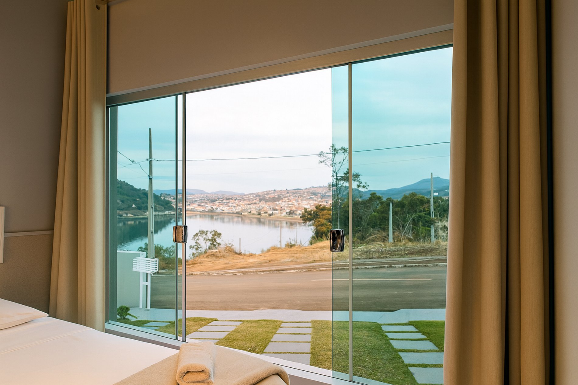 Quarto com vista panorâmica para o lago e montanhas.