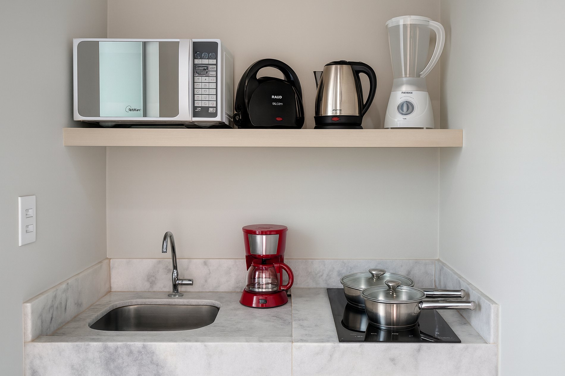 Cozinha :Frigobar, mesa com 2 cadeiras, fogão cooktop 2 bocas, microondas, liquidificador, máquina de café, Chaleira, Panelas e Talheres, TV Smart.